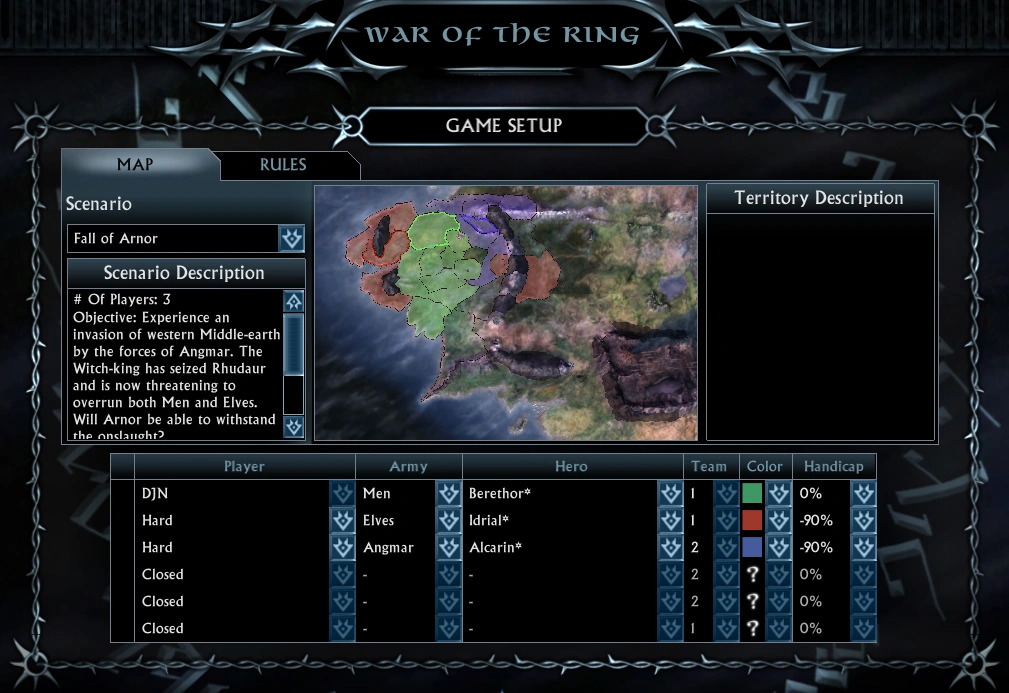- War of the Ring - Win by conquering all of the enemies' claimed territories - The only scenario in which the player presets how many factions there are.