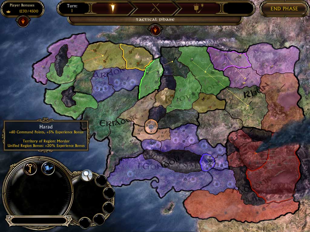 Each turn is made of three phases: the Tactical Phase, during which all factions plan their moves and constructions, the Battle Phase, during which any enemies that have ended up in the same territory battle each other (either with Auto-Resolve or with Real-Time, which takes the player into a skirmish), and the Retreat Phase, during which any conquered host retreats back into a certain territory of theirs.